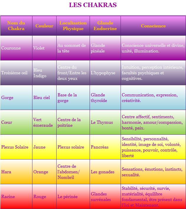 Vous trouverez dans le fichier ci-après, table-des-chakras.pdf , une table référence des chakras que j'ai eu sur le site très bien fait suivant: http://www.healer.ch/fr/f-Chakras.html#chakra_eng_.
